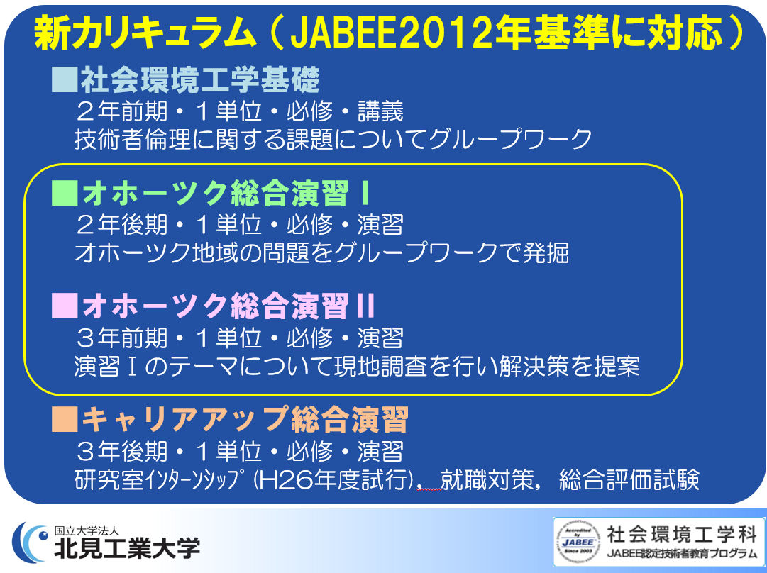 本学科では2012年度から新カリキュラムを導入し,チュートリアル教育やグループワークを取り入れた講義・演習を下図のように4科目新設しました.そのなかで,『オホーツク総合演習』はⅠとⅡに分かれ,Ⅰではオホーツク地域が抱える問題点について,外部講師の講演や自らの調査,ブレーンストーミングなどを通じて学生自ら問題を発掘し,問題解決策をチームで考えます.そして,その問題点と結果を発表し一次報告書にまとめます.Ⅱでは,Ⅰの結果をベースに,地域が抱える問題点に対するより具体的かつ有効な解決策をチームによる実務者への質問・討議,現地調査などを通じて見つけ出します.そして,その結果を最終報告書にまとめるとともに、公開された発表会で成果を披露・意見交換をします.発表会では,学生,教員,外部講師等によって優秀な発表に投票し,上位2チームを選出して後日表彰します.